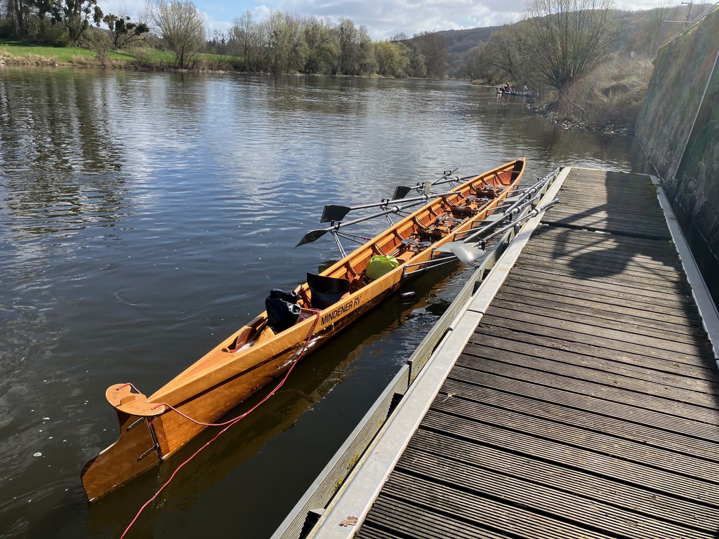 Die so genannte „Dreiecksfahrt“ führt uns vom Bootshaus weserabwärts bis zum Wehr Petershagen und über die Bootsrutsche bis nach Windheim. Dort biegen wir in den Windheimer Schleusenkanal ab und fahren den Kanal mit Schleusung bergauf bis er wieder in die Weser mündet. Den Rest der Strecke rudern wir gegen die Strömung zurück zum Bootshaus.